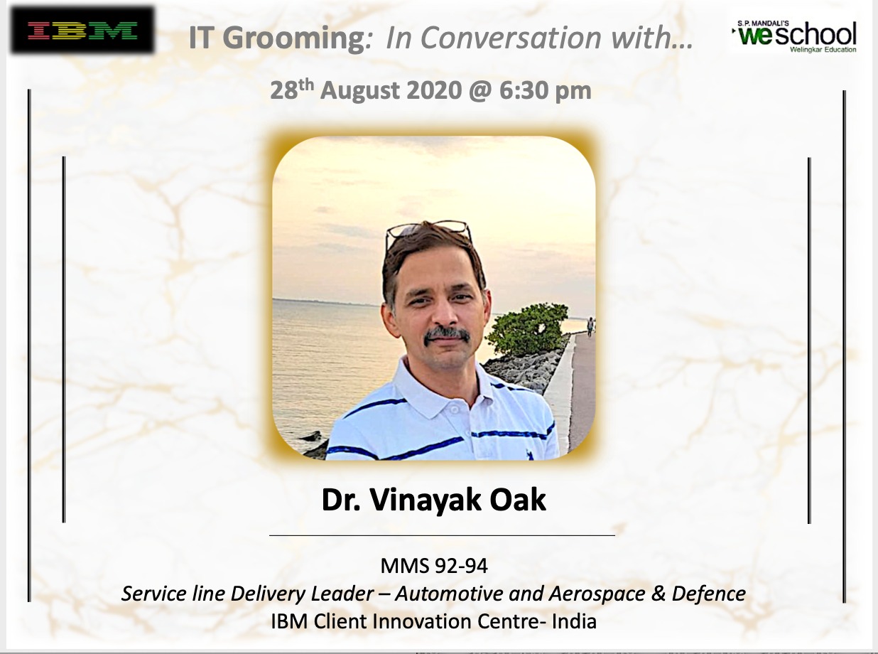 The series of Alumni Insights 2020 in the last week August 2020 saw the one of the senior alumnus Dr. Vinayak Oak, MMS 92-94 Batch Alumnus, IBM Client Innovation Centre – India, Service line Delivery Leader – Automotive and Aerospace & Defence, IBM India Pvt. Ltd interact with the students at WeSchool as a part of their grooming session.