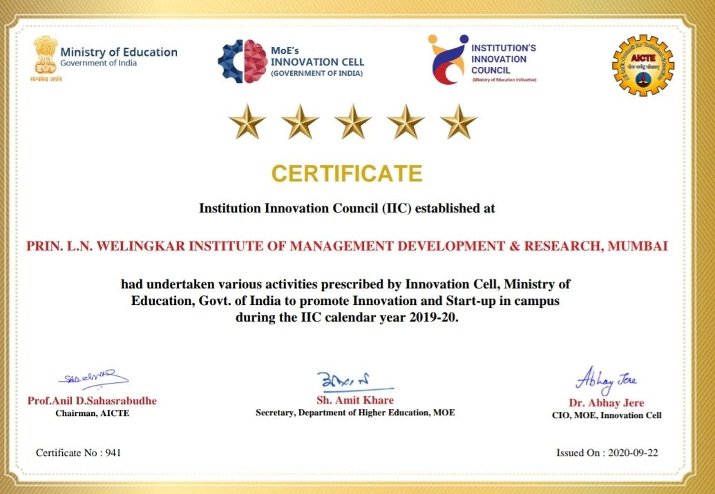 WeSchool takes pride in sharing that the Innovation Cell, Ministry of Education, Govt. of India has awarded WeSchool with a five star rating for promoting innovation and start-up in campus during the Institution Innovation Council (IIC) calendar year 2019-20.